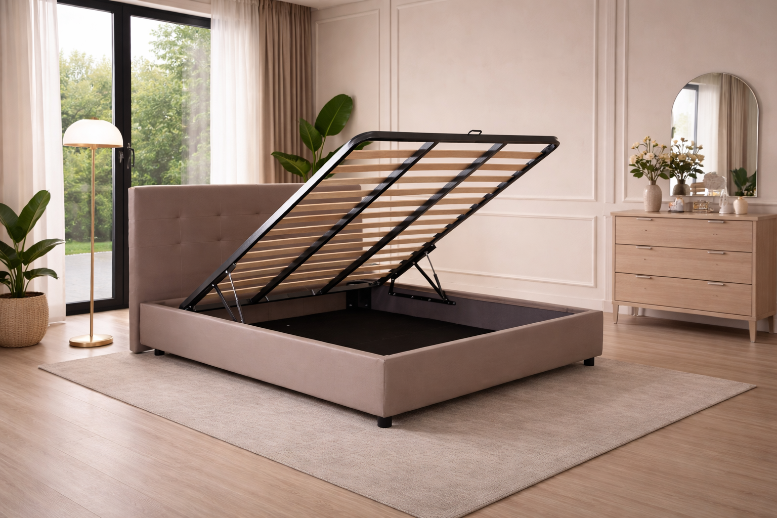 Progettato per offrire un’esperienza d’uso superiore, Statuario integra un ampio vano contenitore facilmente accessibile, perfetto per custodire biancheria, plaid, cuscini e accessori mantenendo l’ambiente sempre ordinato. Il sistema di apertura assistita garantisce un sollevamento morbido, stabile e ben bilanciato, rendendo ogni gesto semplice e naturale.