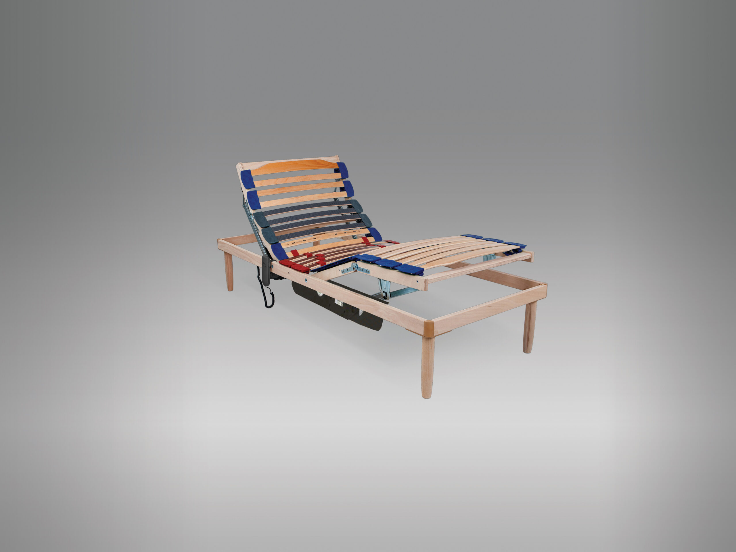 Il piano di riposo è composto da doghe ergonomiche in faggio multistrato naturale con regolatori di rigidità, che consentono di personalizzare il sostegno nella zona lombare.